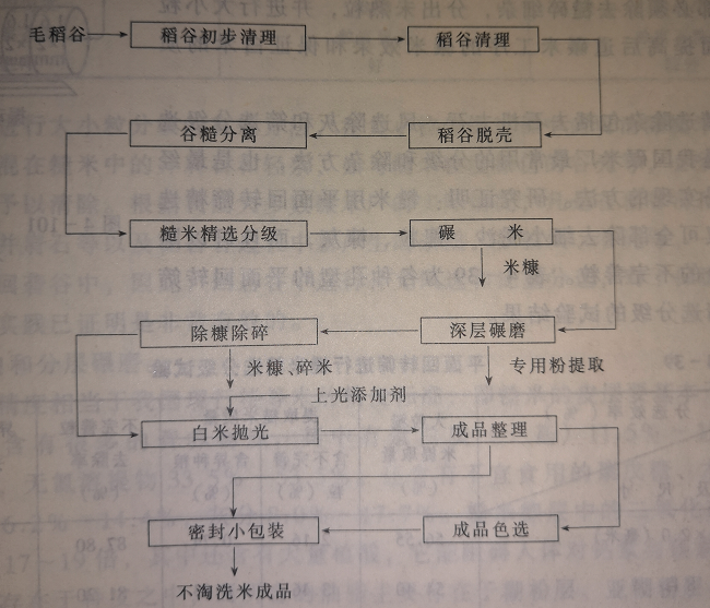 看圖后發現,不淘洗大米加工設備的生產流程在礱谷前與普通生產工藝基本相同。不同之處是對糙米進行精選和除雜、多道碾白、分層碾磨、白米去糠上光、色選等工序。大米經該機加工后,無色澤和氣味上的不同,更不允許出現發霉變質的米粒。